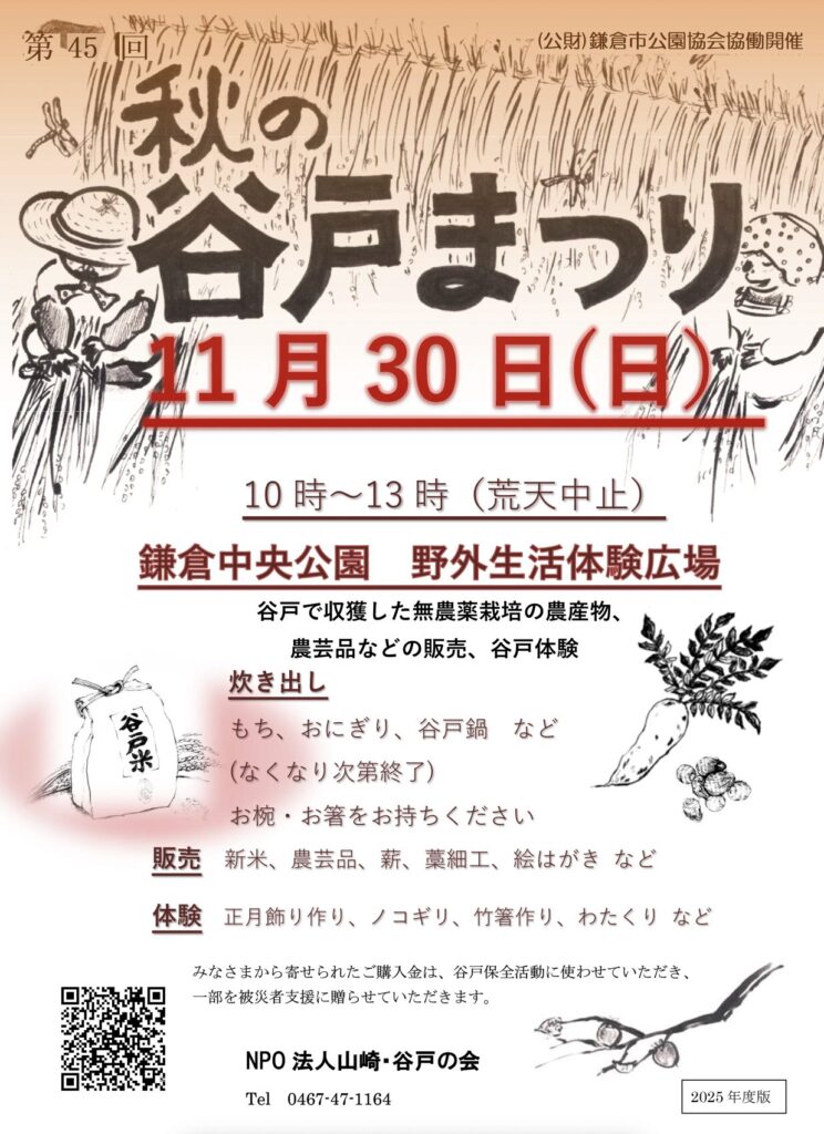@NPO法人山崎・谷戸の会 11月30日(日)10時から、鎌倉中央公園 野外生活体験広場にて「秋の谷戸まつり」を開催します。 谷戸で収獲した無農薬栽培の農産物、農芸品などの販売や、楽しい谷戸体験もあります。